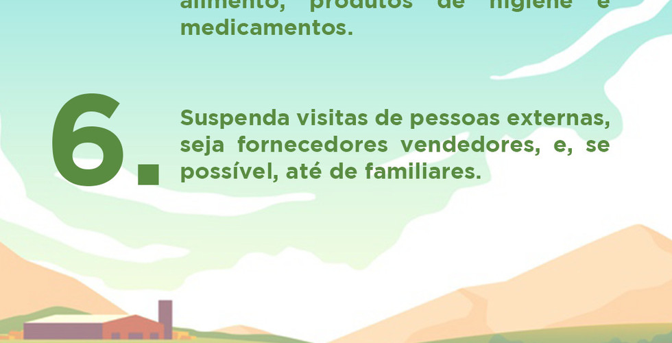 4. Suspenda o recebimento de produtos que não sejam necessários no momento. as saídas e entradas de produtos na comunidade devem ser evitadas, se possível, mantendo apenas as atividades essenciais. Se for indispensável a aquisição de produtos, higienize as embalagens, assim que chegarem à propriedade.